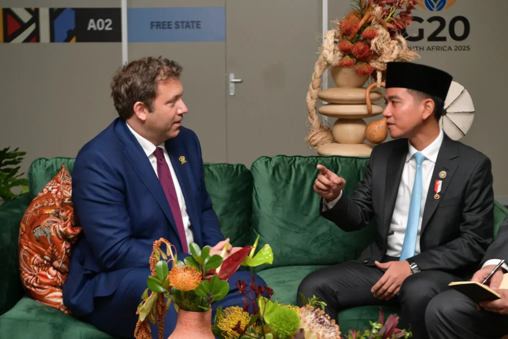 Di sela-sela rangkaian kegiatan KTT G20 hari ke-2, Wakil Presiden (Wapres) RI Gibran Rakabuming melakukan pertemuan bilateral dengan Wakil Kanselir Republik Federal Jerman, Lars Klingbeil, di Johannesburg Expo Centre, Afrika Selatan, Minggu (23/11/2025). Pertemuan ini menjadi momentum penting untuk memperkuat hubungan Indonesia–Jerman, terutama dalam bidang industri, politik, dan ekonomi. Langkah ini sejalan dengan arahan Presiden